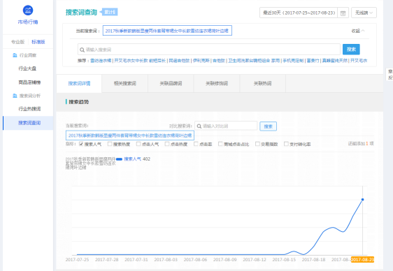 进入生意参谋,在市场行情里搜索词查询,将你的核心词输入在搜索栏的进行搜索,会显示非常多和你核心词相关的其他词,我们可以留下符合我们宝贝属性的长尾词,然后参考他的商城点击占比,在线商品数,搜索人气来寻找一些需求高,竞争低的长尾词。(2)Pc端下拉框