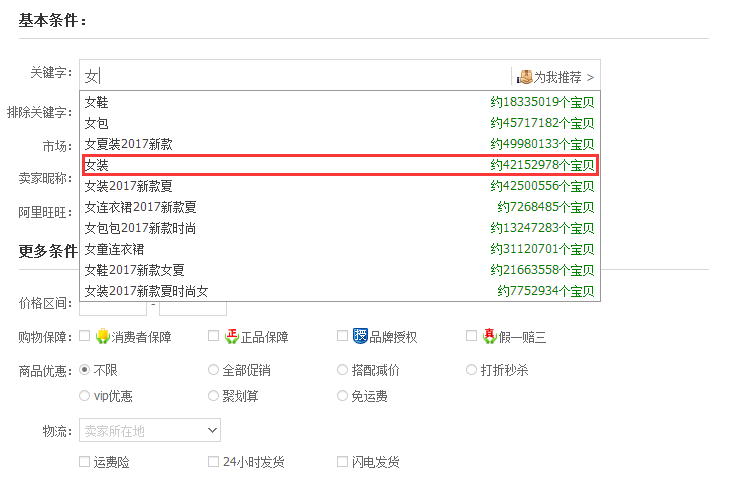 首先我要来给大家说的是,女装没有一款产品是可以来满足所有买家的需求的,而个体的差异化,会对统一类目产生不一样的需求。举个例子,如果你是卖女装的。然后我们点开淘宝的高级搜索,我们就可以看到现在的女装宝贝有400多万